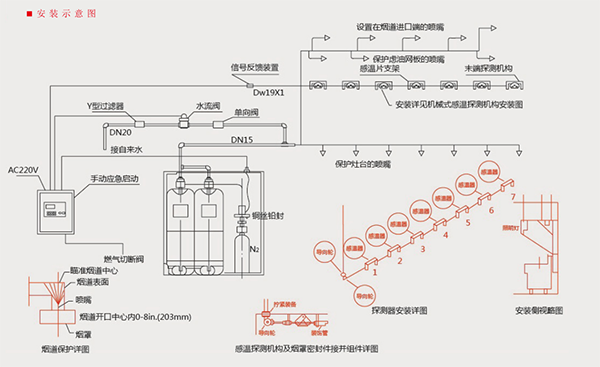 本裝置是一套獨(dú)立的現(xiàn)代商用廚房專用自動(dòng)滅火系統(tǒng),有自動(dòng)、手動(dòng)、機(jī)械應(yīng)急三種啟動(dòng)方式。