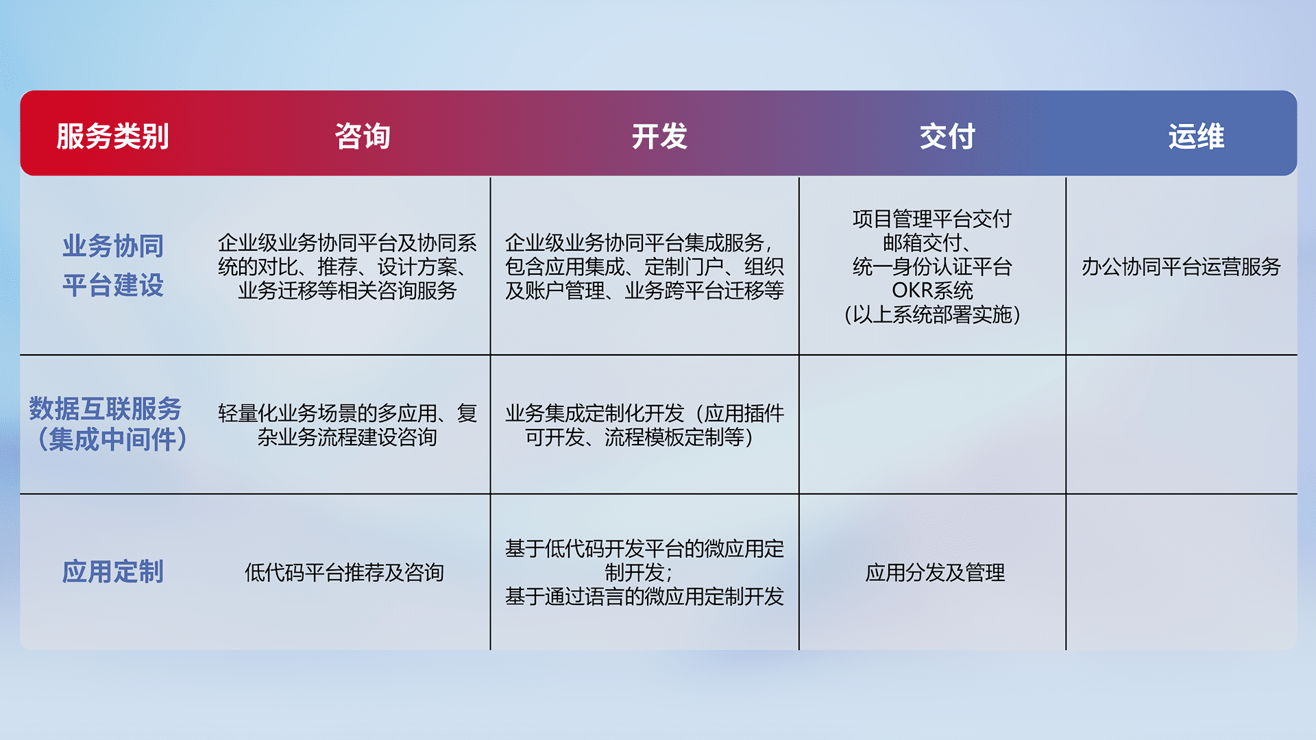 针对钉钉、、、、企微、、IDaas等平台级产品提供产品的规划、、方案、、交付、、、定制化开发等服务,,,实现如统一协同办公、、、、智能客户服务、、混合会议管理、、、智能数据查询、、、等业务场景,,,实现数字化转型。。。。